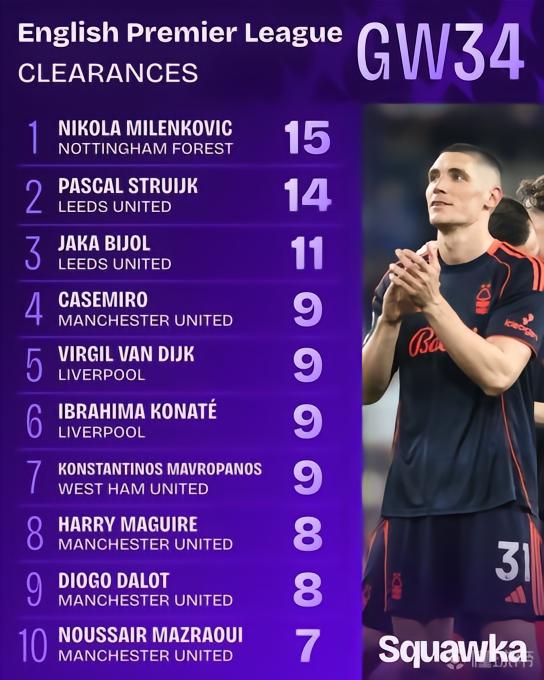 随着今天凌晨曼联主场击败布伦特福德,本赛季英超第34轮的比赛也全部结束。北京时间4月28日,Squawka公布了英超第34轮球员解围榜单。