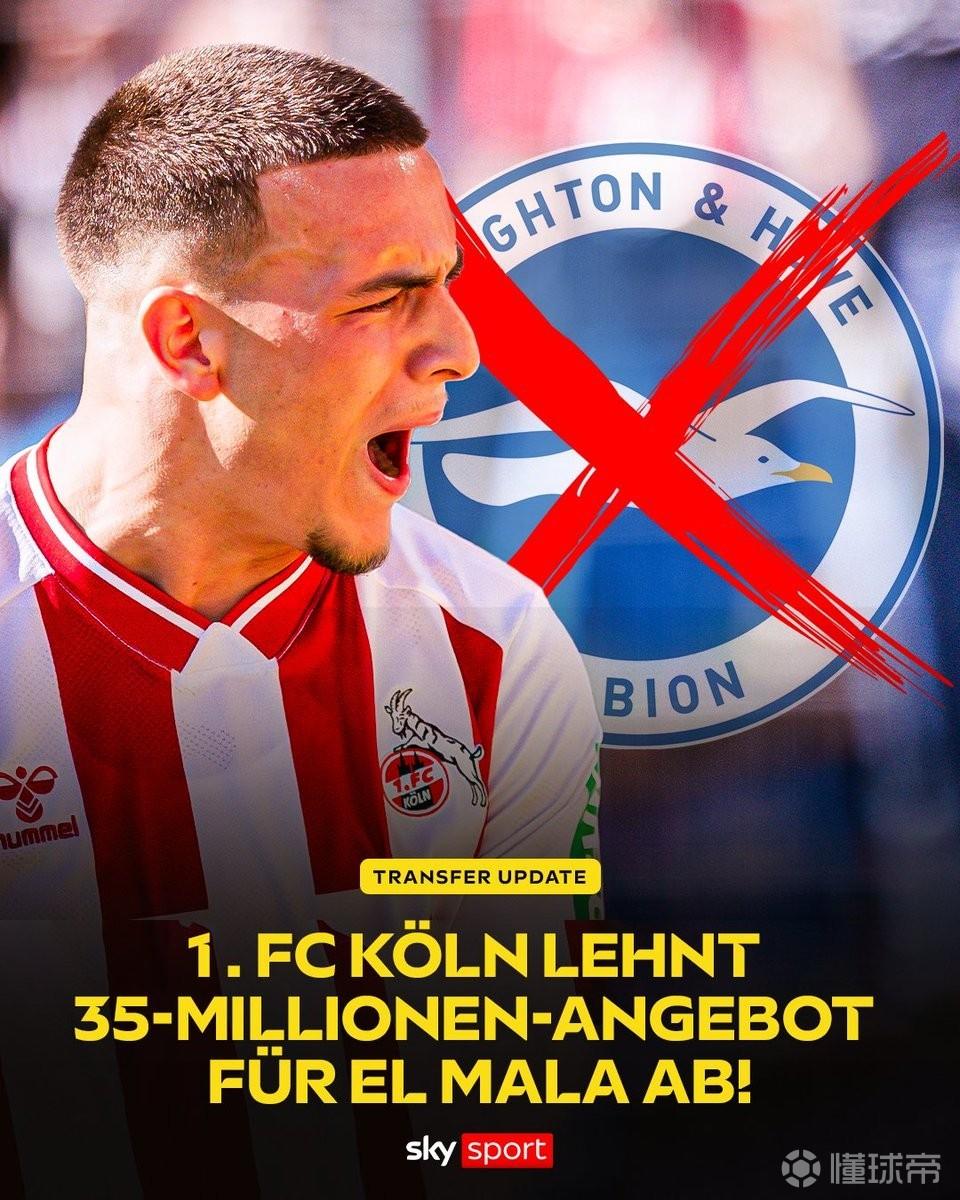 根据德国天空体育的最新消息,科隆拒绝了布莱顿对马拉开出的3500万欧元报价,俱乐部已为这名19岁小将定下5000万欧元的标价。