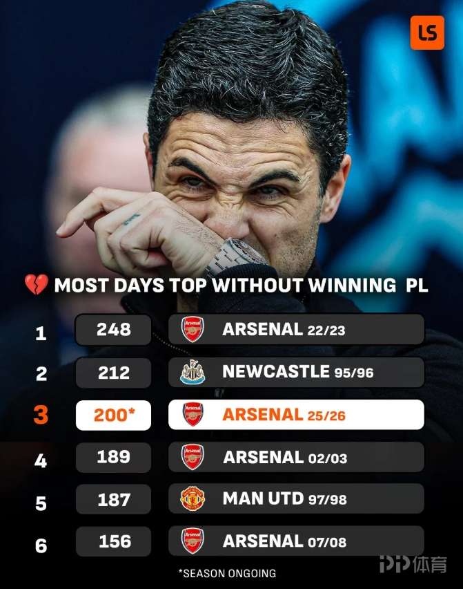 英超领跑天数最多却未能夺冠排行:阿森纳本季第3 第一也是枪手 发布时间:2026-04-24 00:17:00 | 浏览: 次 直播信号源 体育直播专业赛事解说 免费直播 4k超清直播 美女专业解说(无插件) 阿森纳本赛季在榜首停留了200天,却在昨晚跌落至次席。据LiveScore的数据显示,如果本赛季最终未能夺冠,他们将可能成为英超历史上“领跑天数最多却未能夺冠”的第三悲情球队 。 责任编辑: 体育24小时热点 标签: 体育 PP体育 聚力体st育 英超直播 西甲 亚冠直播 欧冠直播 德甲直播 欧联杯 CBA 篮球直播 WWE直播 UFC直播 体育直播