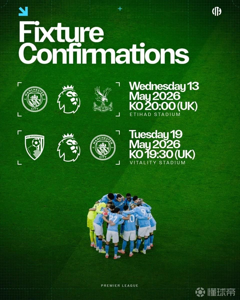 随着英超第37轮以及对阵水晶宫补赛的开球时间确定,曼城将在6天内进行三场比赛,包含两场英超比赛和中间一场足总杯决赛。