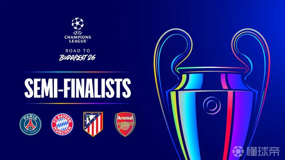 欧冠1/4决赛战罢,巴黎圣日耳曼、马德里竞技、拜仁慕尼黑和阿森纳晋级四强,知名数据机构Opta预测了各队打进决赛以及夺冠的可能性。