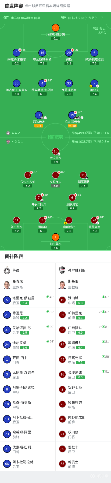 第65分钟,萨德反击,菲尔米诺抢点破门扩大比分,萨德3-1神户