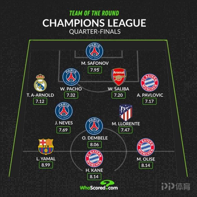 欧冠八强战已经完赛,whoscored也列出了本轮评分最佳阵容,巴黎4将、拜仁3人。